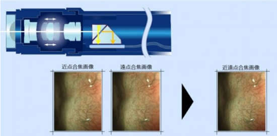 近い距離と遠い距離のそれぞれに焦点が合った2つの画像を同時に取り出して合成する技術です。心臓の拍動や消化管の蠕動運動などの僅かな動きがあっても、EDOFを用いることで幅広い範囲に焦点が合った明瞭な内視鏡画像を得ることが可能です。この技術が内視鏡に搭載されたのは「EVIS X1」が世界初となっています。